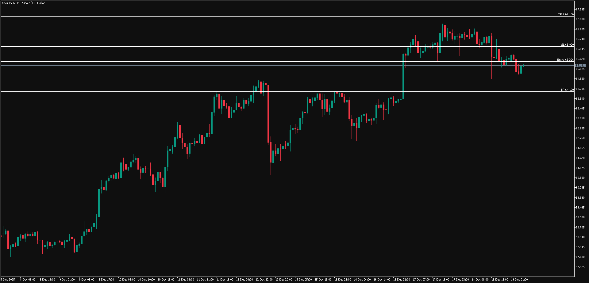 Cermati pergerakan harga Perak jika terus bertahan di bawah area 65.306-65.900, di mana harga Perak berpotensi turun lebih lanjut ke sekitar area 64.100.