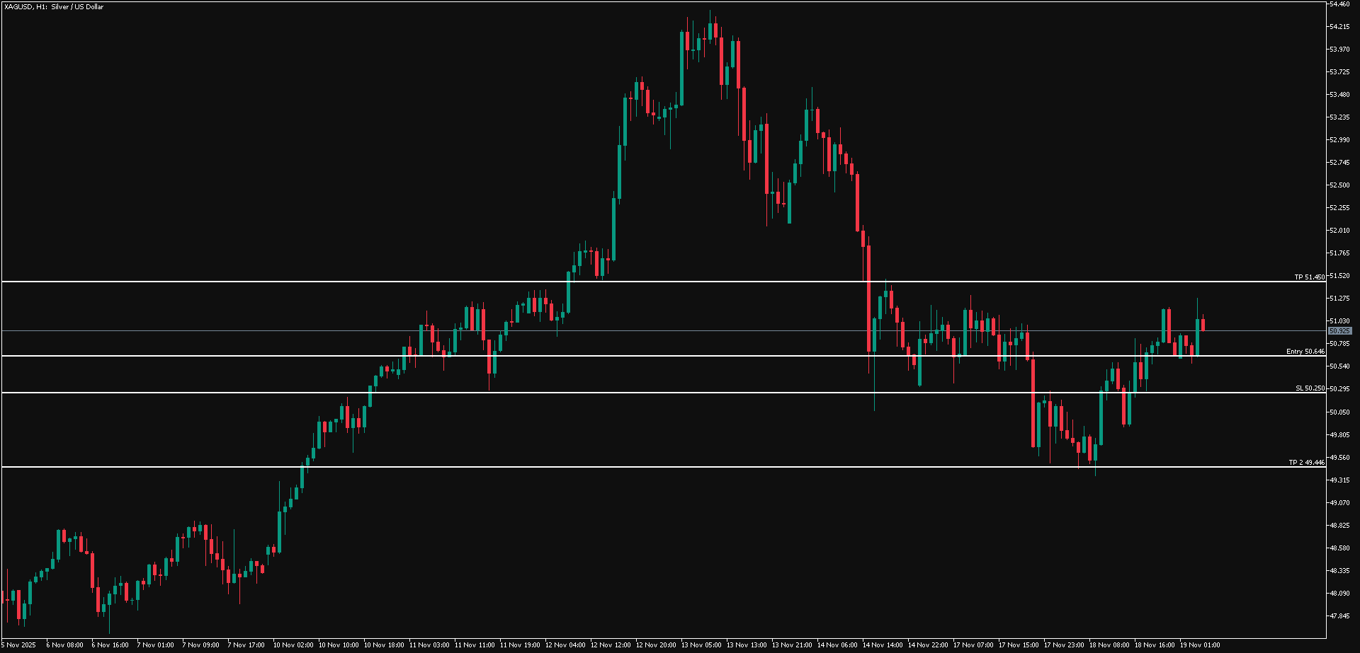 Cermati pergerakan harga Perak jika terus bertahan di atas area 50.646-50.250, di mana harga Perak berpotensi naik lebih lanjut ke sekitar area 51.450.