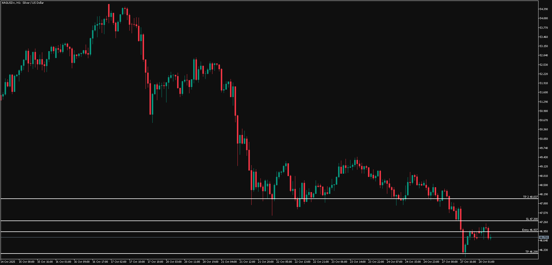 Cermati pergerakan harga Perak jika terus bertahan di bawah area 46.937-47.300, di mana harga Perak berpotensi turun lebih lanjut ke sekitar area 46.200.