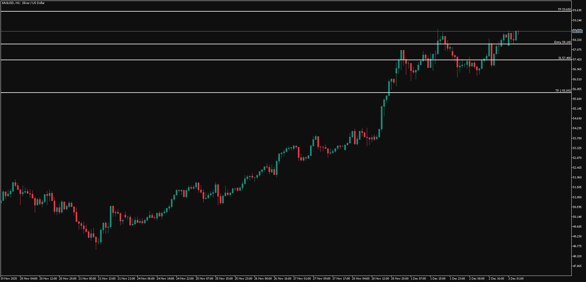 Cermati pergerakan harga Perak jika terus bertahan di atas area 58.143-57.400, di mana harga Perak berpotensi naik lebih lanjut ke sekitar area 59.650.