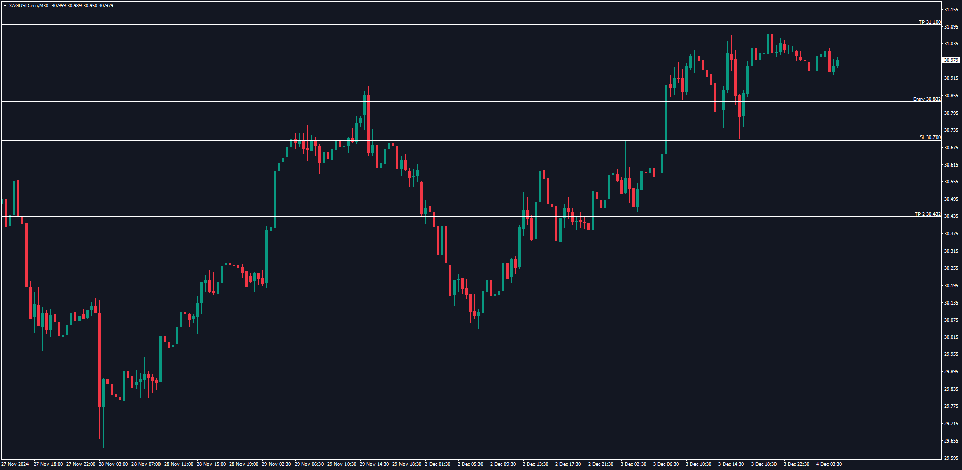 Cermati pergerakan harga Perak jika terus bertahan di atas area 30.832-30.700, di mana harga Perak berpotensi naik lebih lanjut ke sekitar area 31.100.