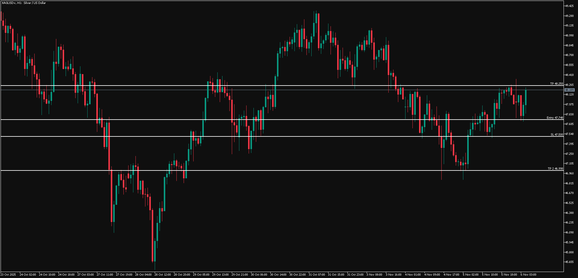 Cermati pergerakan harga Perak jika terus bertahan di atas area 47.748-47.500, di mana harga Perak berpotensi naik lebih lanjut ke sekitar area 48.250.